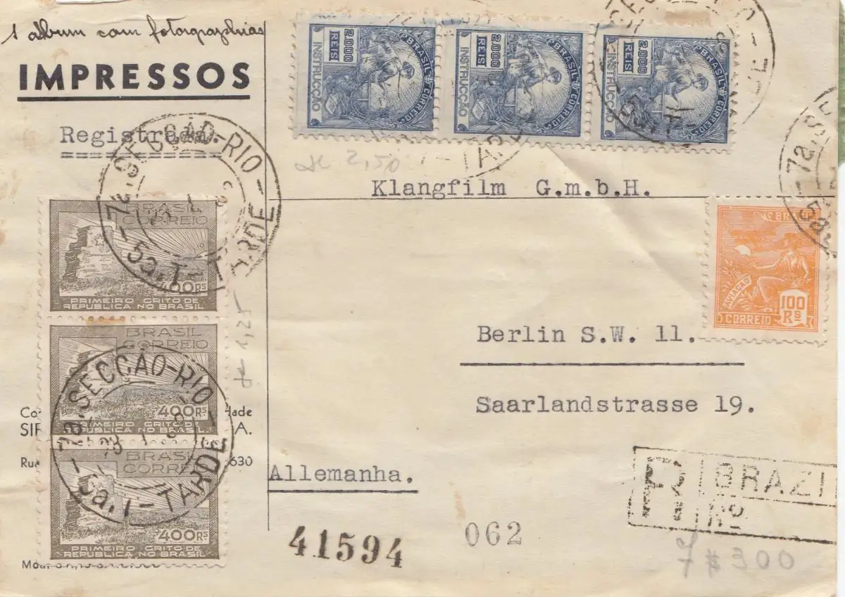 Brazil: 1938: Seccao Rio Tarde, registered front page to Berlin