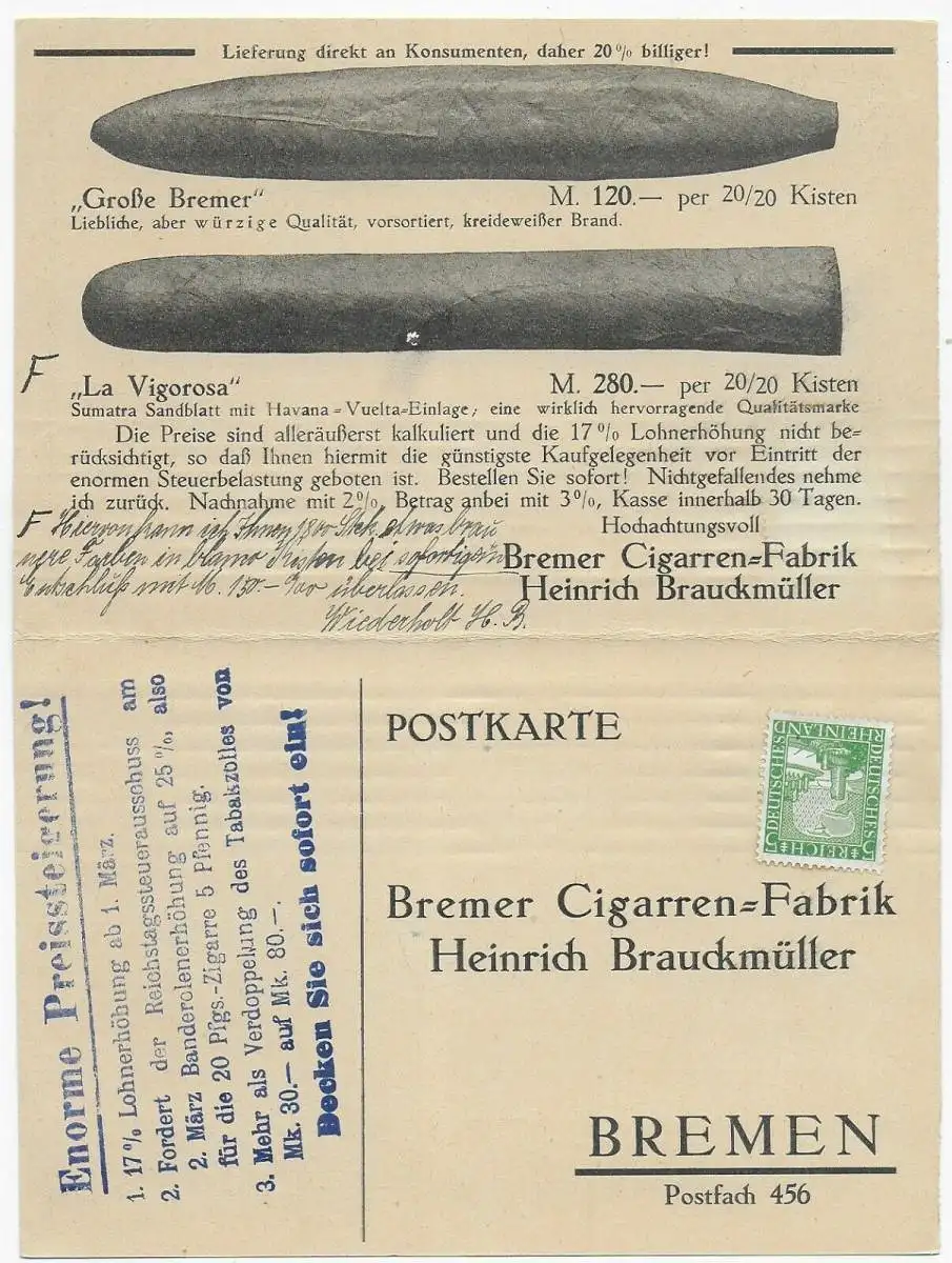 Bremer Cigarrenfabrik Bremen vers Neugersdorf, 1925, avec carte de réponse