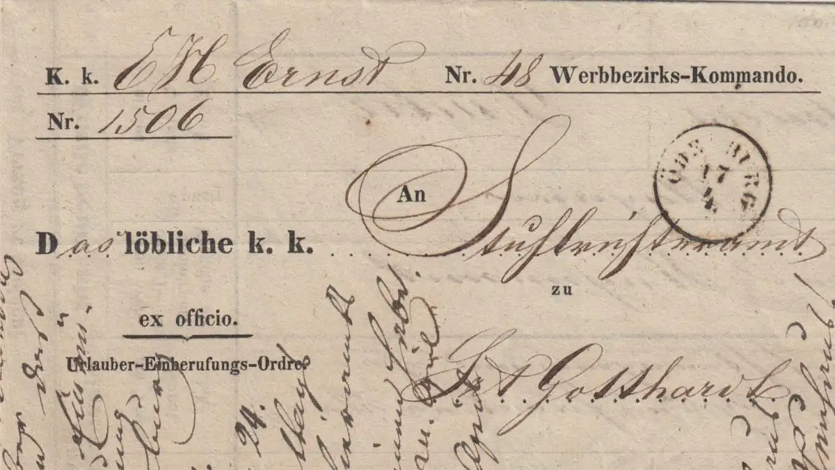 Lettre 1856 - Commandement de district de Werb, Körmer, Gotthard