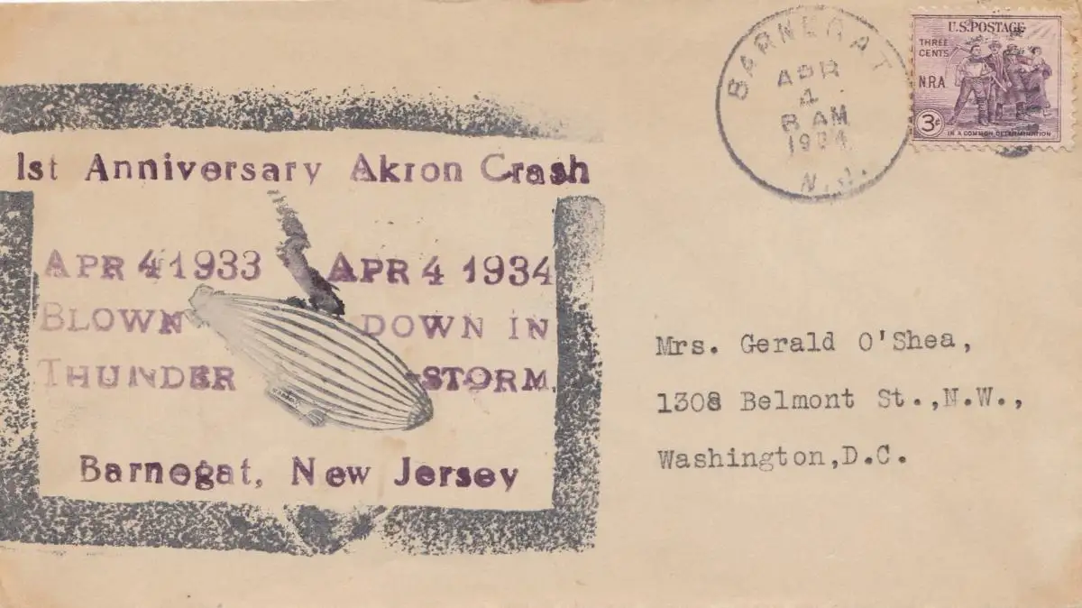 Lettre 1934 1st anniversary Akron Crash-Zeppelin, New Jersey/Barnegat