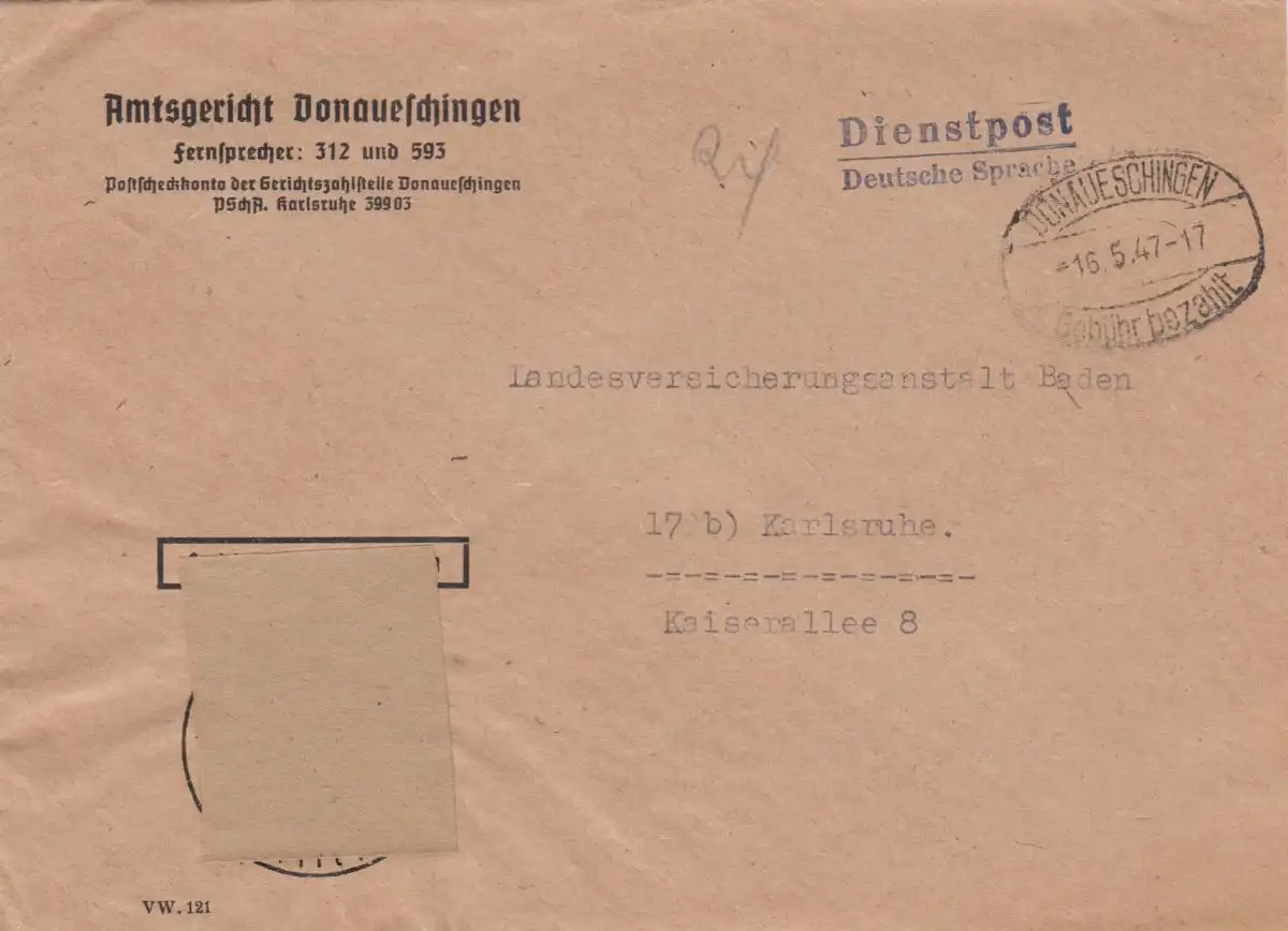 Lettre 1947 tribunal de l'arrondissement Donaueschingen, frais payés, à Karlsruhe