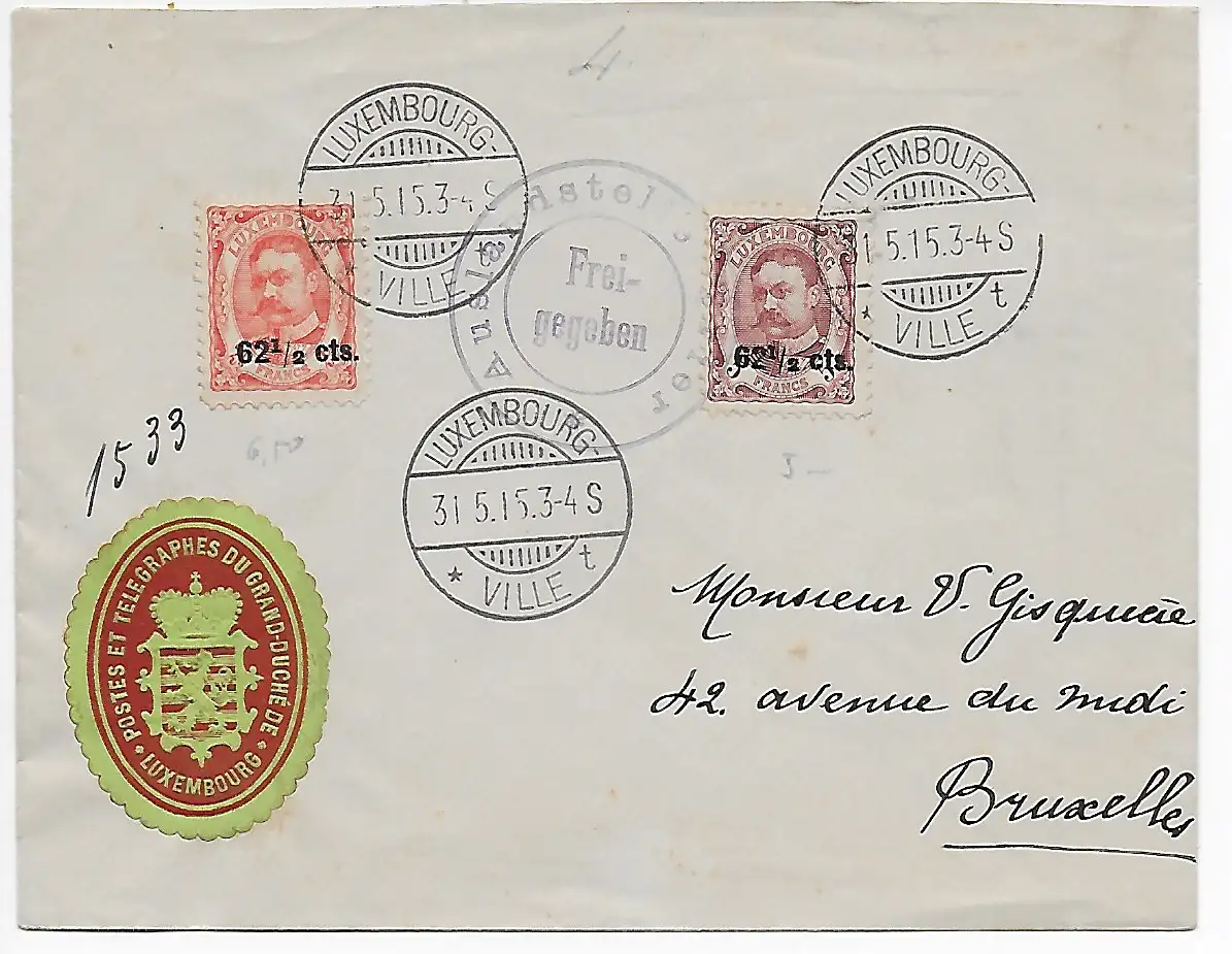 Lettre de Luxembourg à Bruxelles en 1915 avec censure