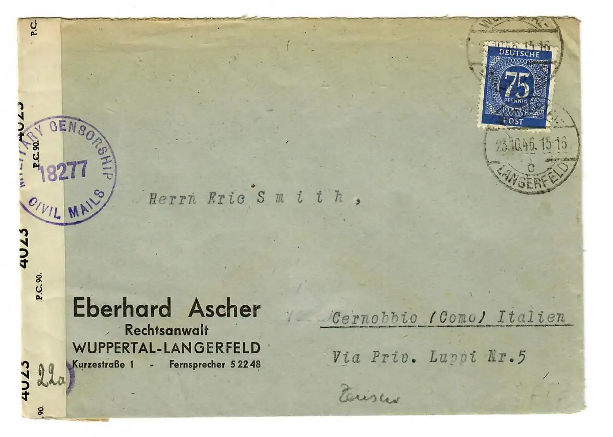 Lettre de Wuppertal-Langerfeld à Gernobbio/Como/Italie 1946, censure