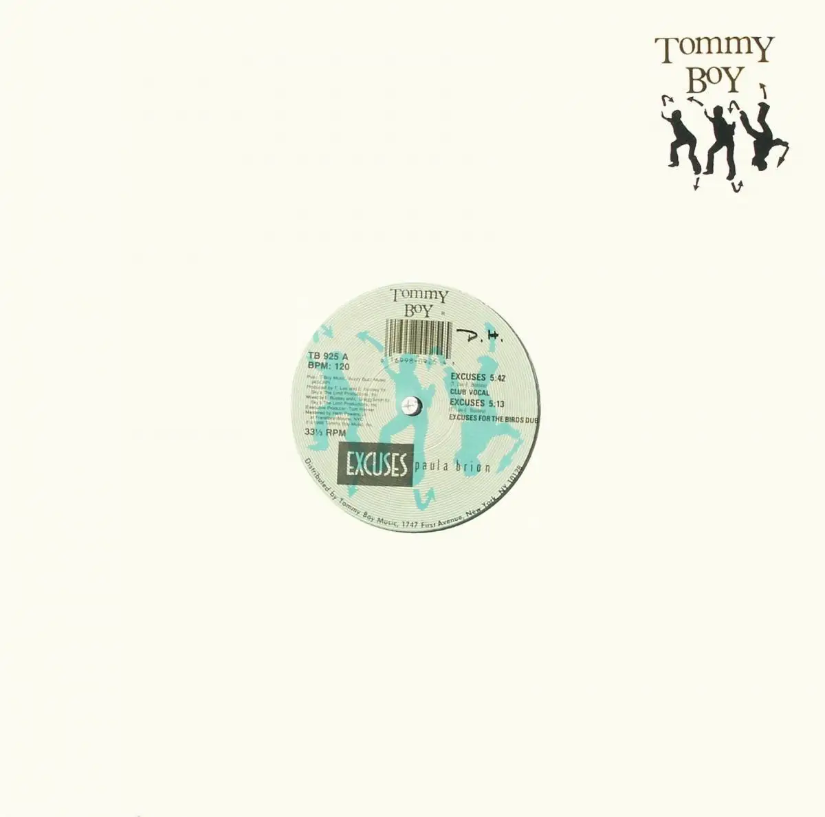 12" Maxi Paula Brion - Excuses, unité de la société de disques, état plaque VG+ coque VD+; Fabriqué dans les États-Unis 1988 Tommy Boy TB 925, pistes [Club Vocal], [Excuses For The Birds Dub], (Liars Choice],[Radio Edit]