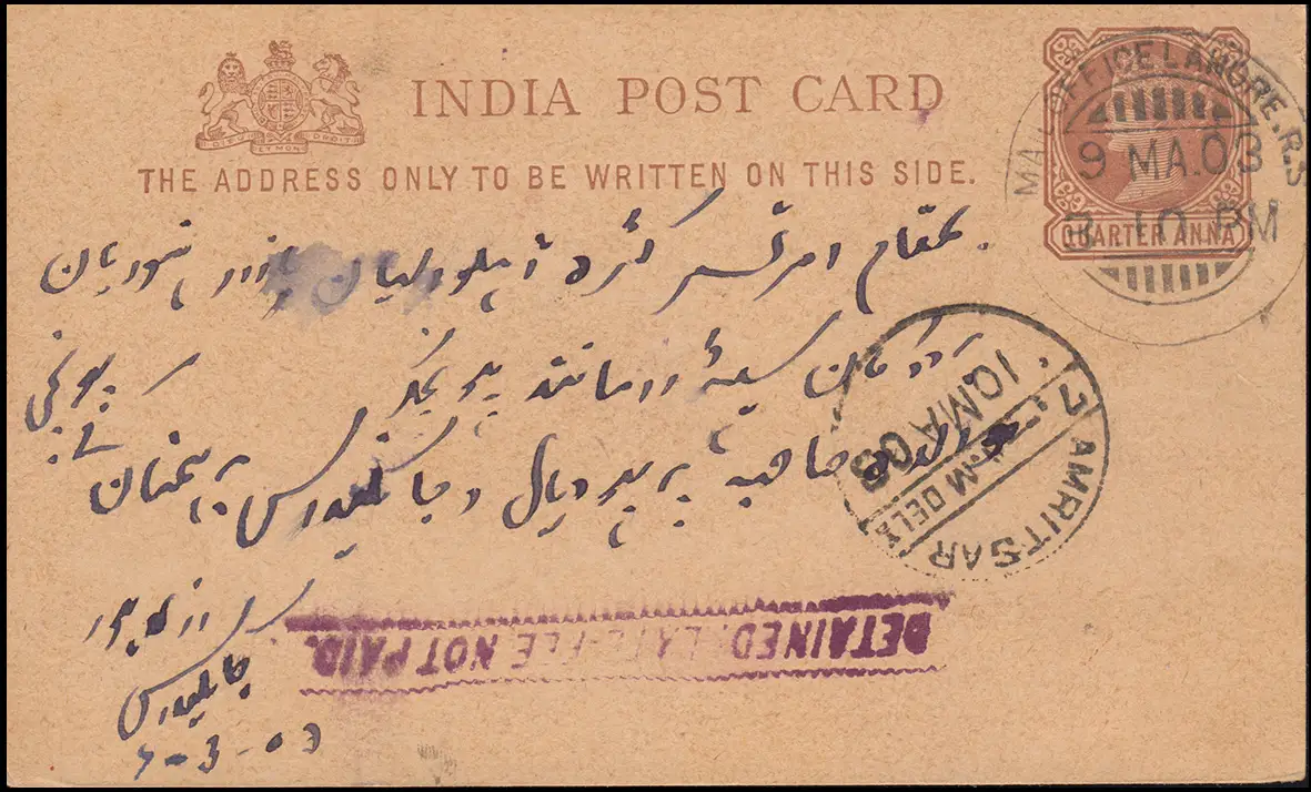 Carte postale britannique 1/4 Anna Detained Late-Fee not Paid LAHORE 9.5.1903