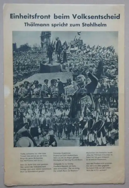 Titre: Front unique au référendum. Thälmann parle au casque d'acier. Gross format (47,3 x 31,5 cm) Brochure avec un grand montage photo sur le devant. Dans le tract, les sociaux-démocrates allemands appellent à ne pas participer au scrutin populaire et à rester chez eux. Rédacteur responsable: G.Wendt. Impression: En avant Imprimerie, Berlin. Le référendum du 9 août 1931 pour la dissolution du Landtag prussien a été déclenché par un appel populaire lancé par le casino républicain. Soutenu par plusieurs partis politiques, le NSDAP a également été soutenu par la KPD. Malgré 93,9 pour cent de refus de voter pour le vote favorable à la participation trop faible de moins de 40%.