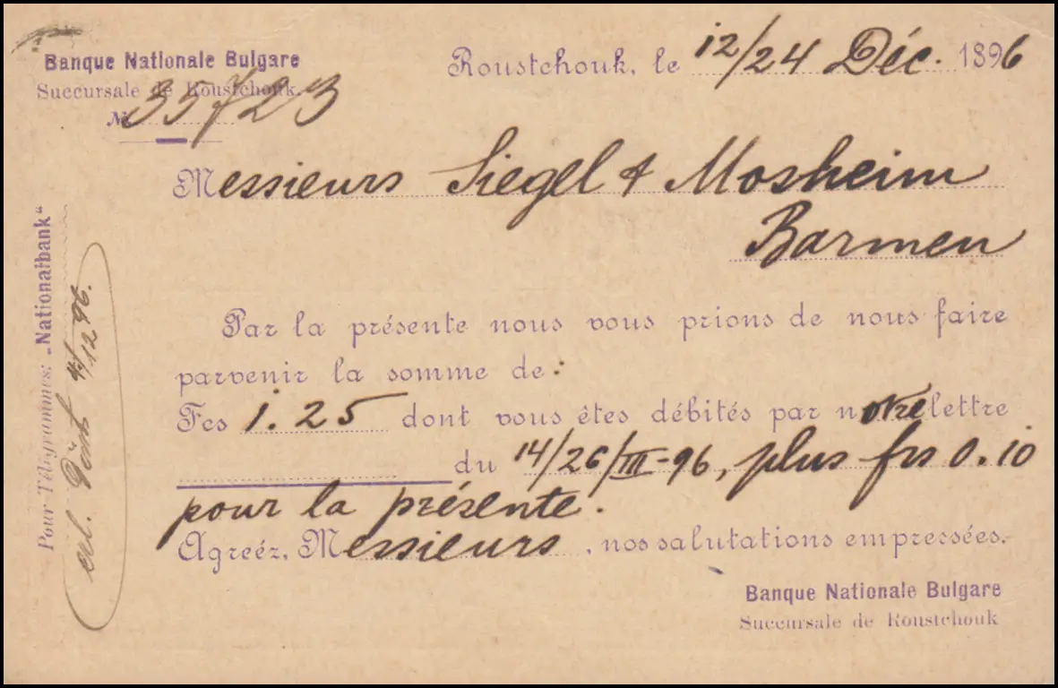 de la Banque nationale bulgare à Rouschouk an Firma Siegel und Mosheim in Barmen / Allemagne N° de catalogue: P8b Examen: original Référence produit: 00000000016532