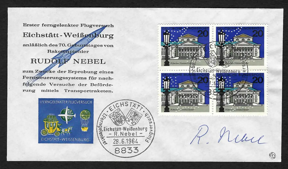 Bund 1964: Ferngelenkter Flugversuch Transportrakete, Autogramm Rudolf Nebel