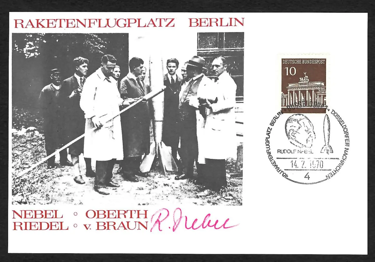 Bund 1970: Raketenflugplatz Berlin erste Flüssigkeitsrakete, Autogramm Ru. Nebel