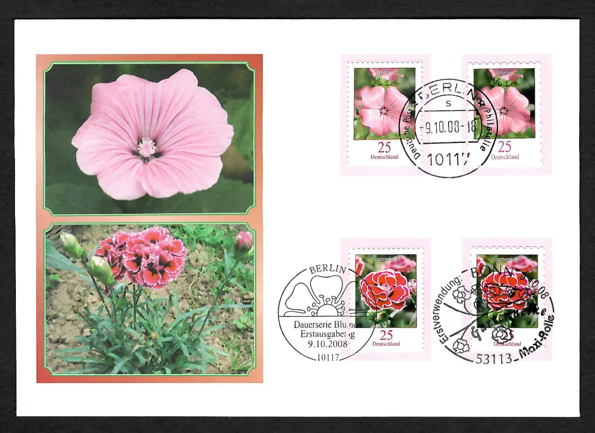 Bund 2008: FDC Dauerserie Blumen, Maxi-Rolle, 3x Sonderstempel