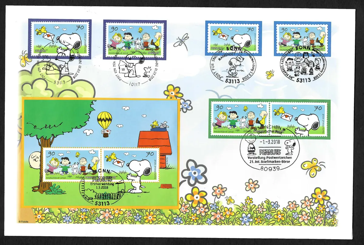 Bund 2018: Peanuts - Snoopy, 4x Marken mit Block, Luxusbrief