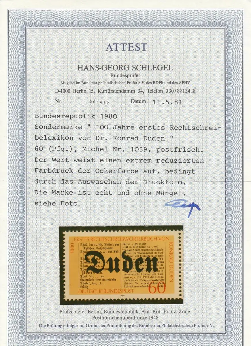 Bund: MiNr. 1039, post-frais, impression de couleur réduite, BPP Attest