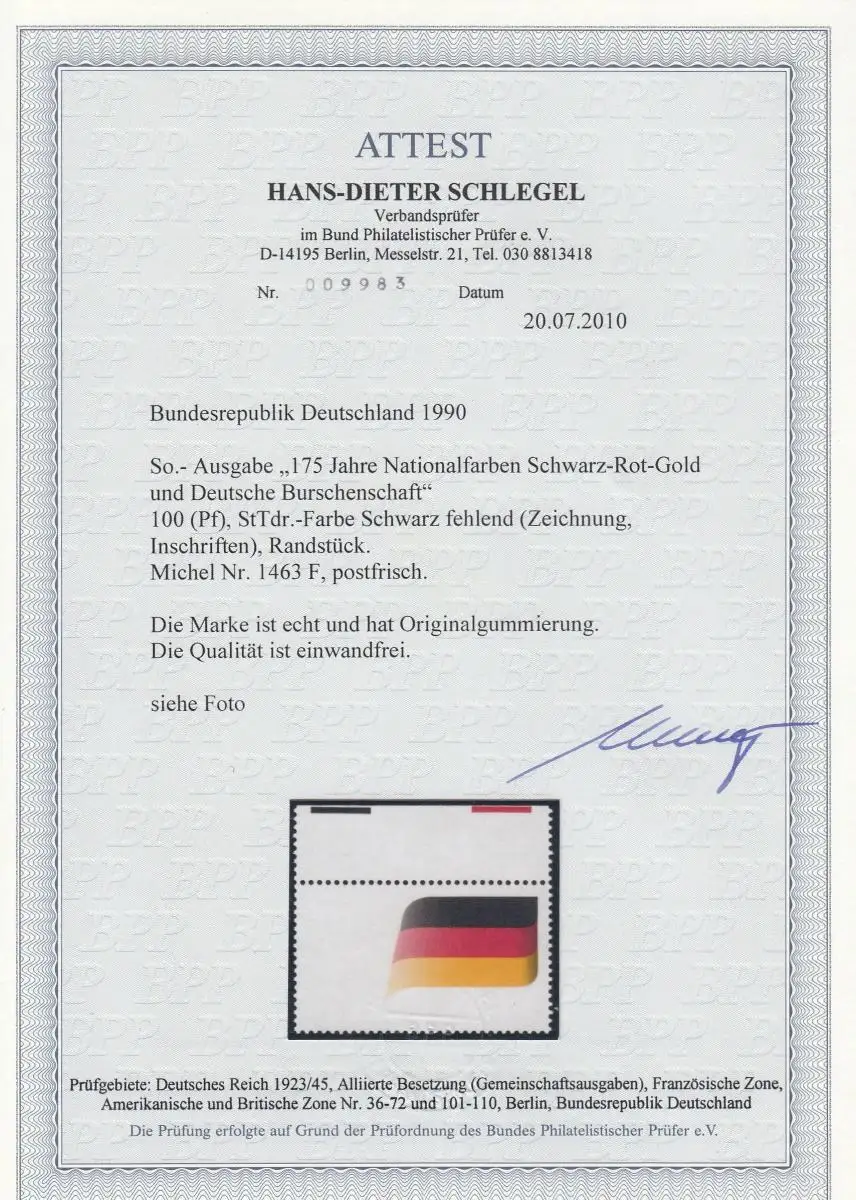 Bund: MiNr. 1463, post-fraîchissement, couleur noire manquante, BPP Attest