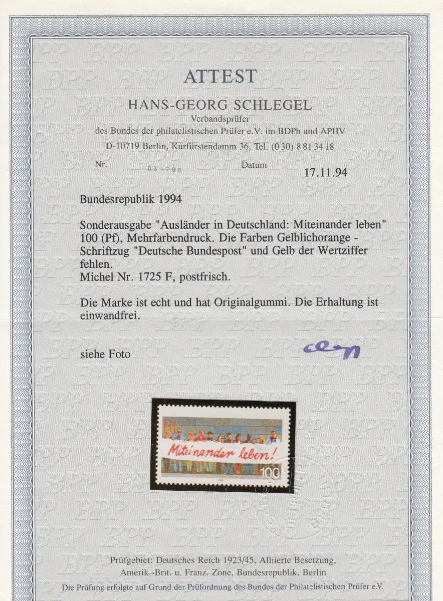 Bund: MiNr. 1725 F, couleurs manquantes partiellement, frais, **, BPP Attest