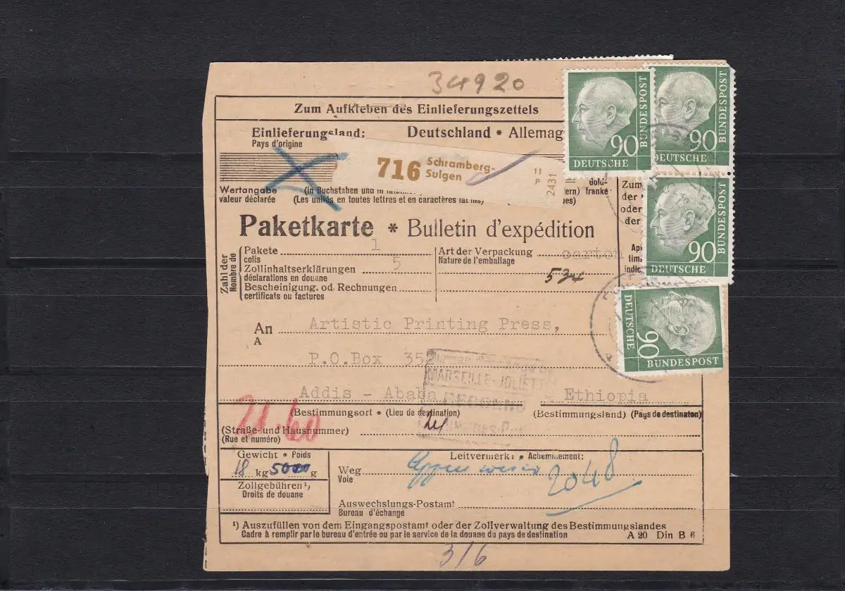 Bund: MiNr. 193 Multi-Frankatur LHX, sur carte de paquet