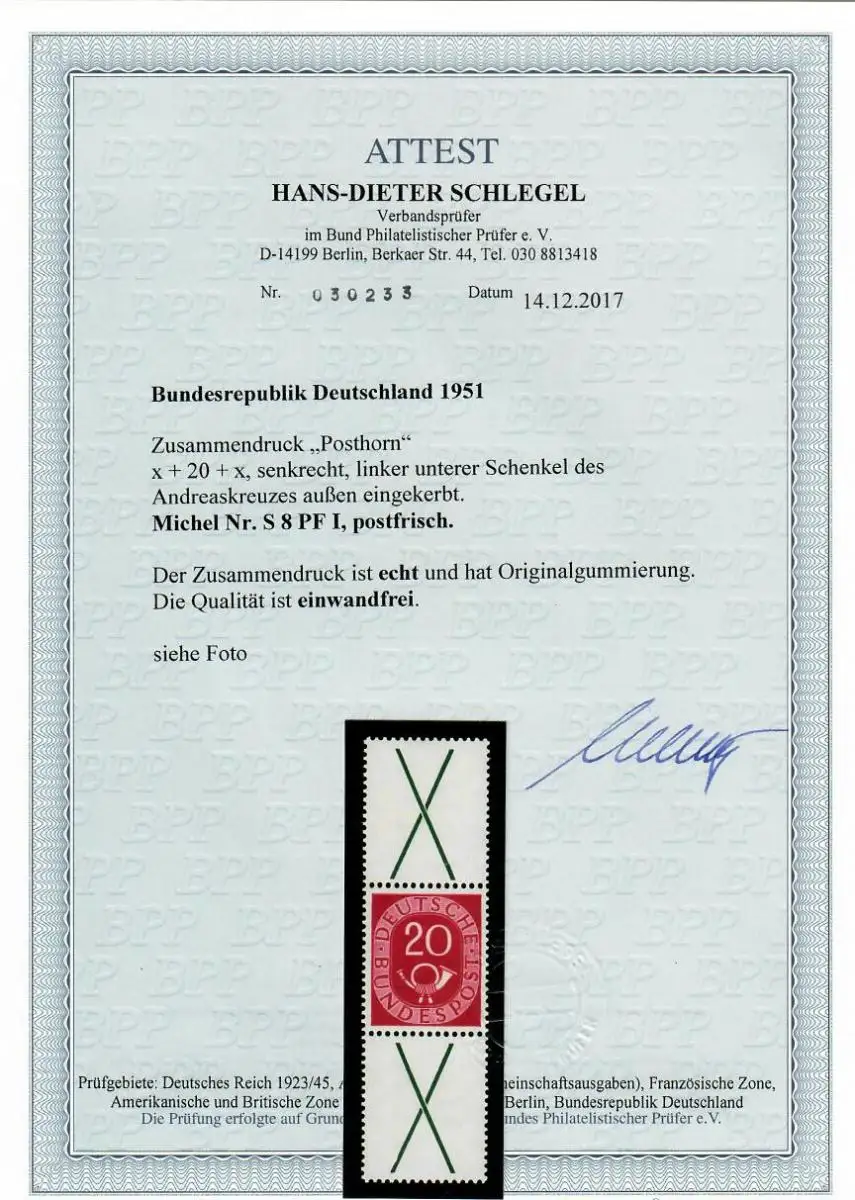 Bundes Posthorn Min. S 8 PF I, post-freich, **, BPP Attest