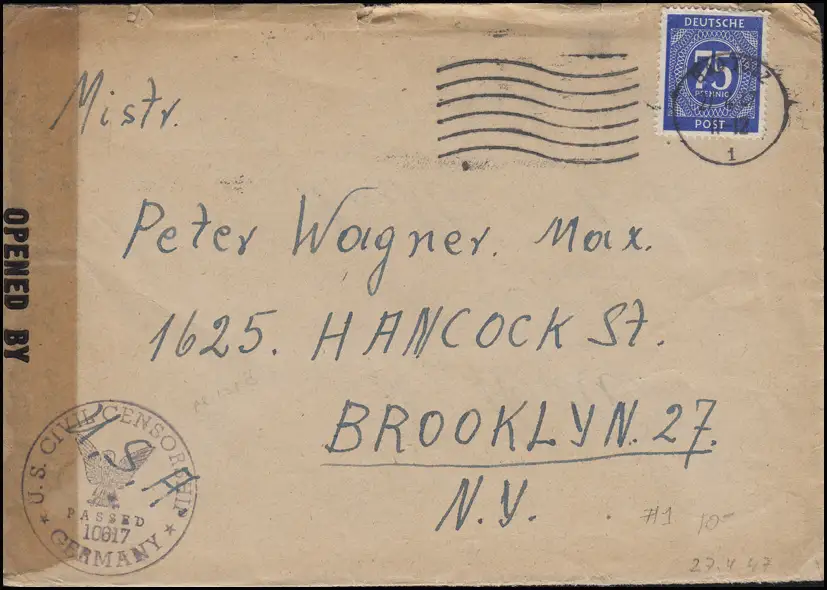 CE 934 point 75 pf. EF Lettre de censure Bad Tölz 27.4.47 vers les États-Unis