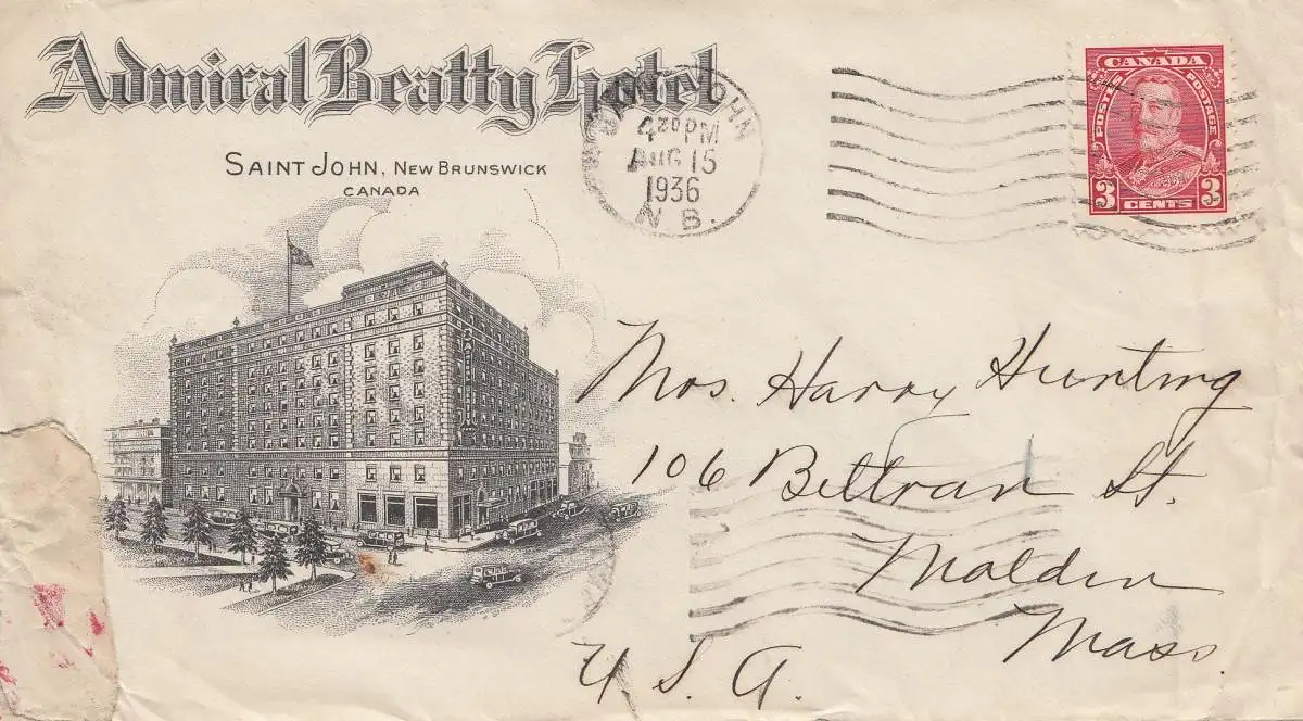 Canada: 1936: New Brunswick - Amiral Beatty Hotel - to Malden-Mass - USA