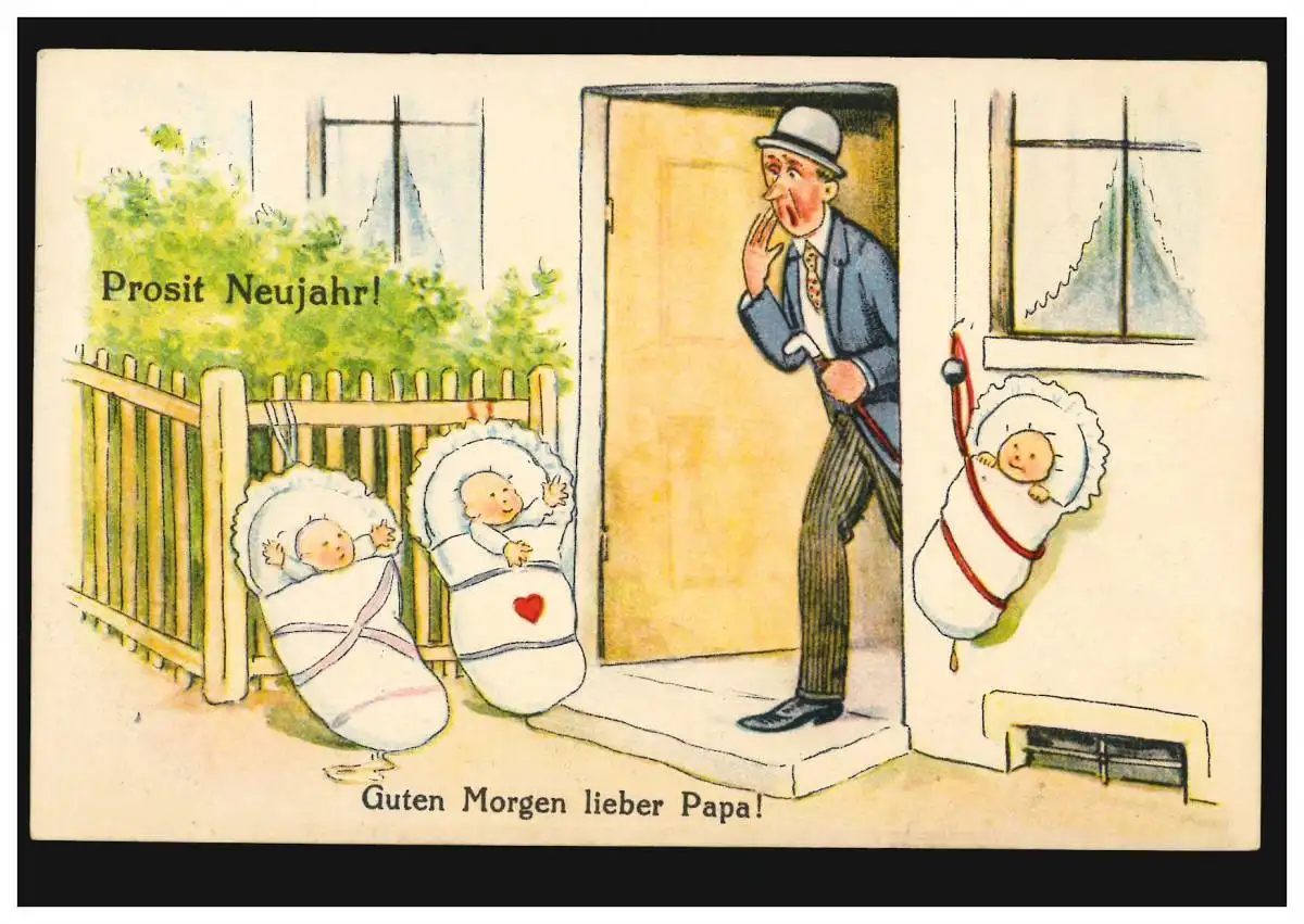 Caricature-AK Nouvel An: Bonjour, cher papa! Drillings à la porte, 31.12.28