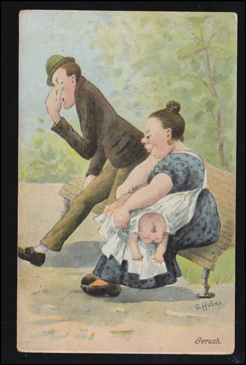 Caricature AK O. Huber: Odeur - Le changement de couche sur le banc, inutilisé