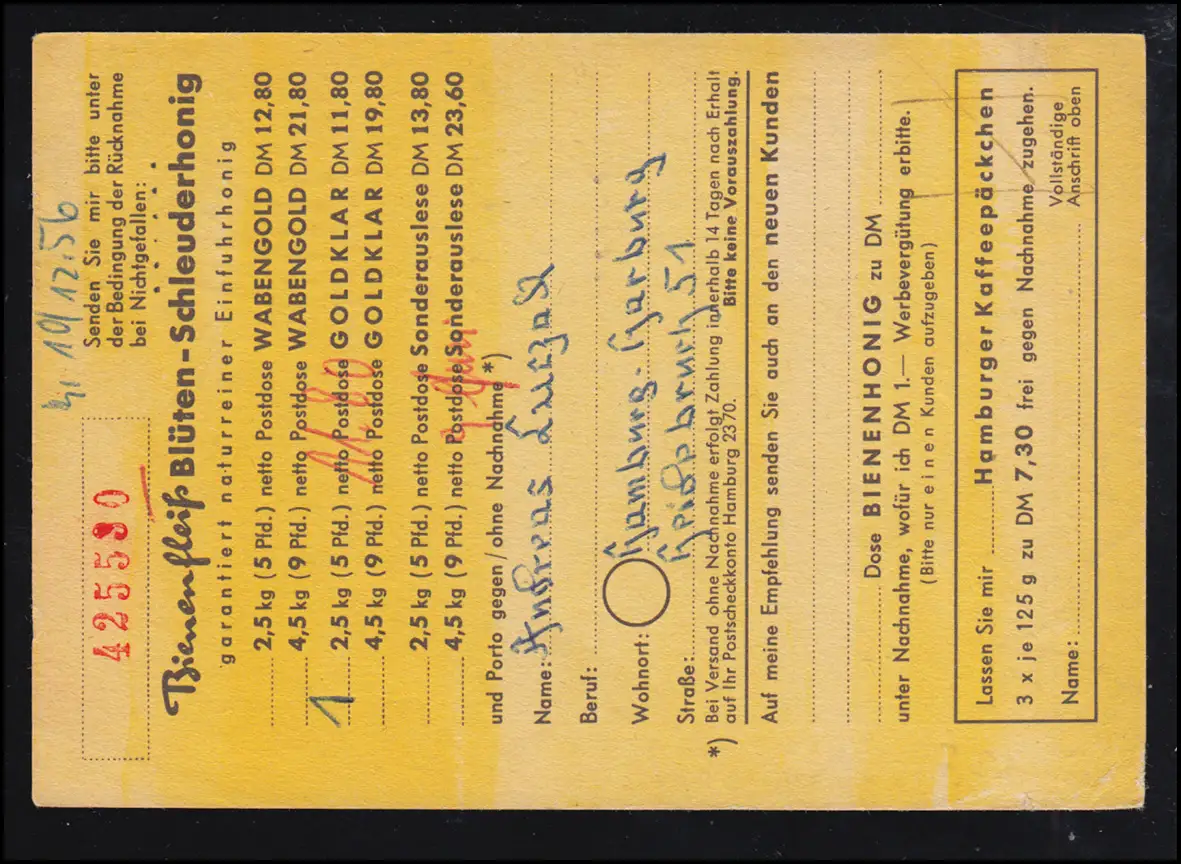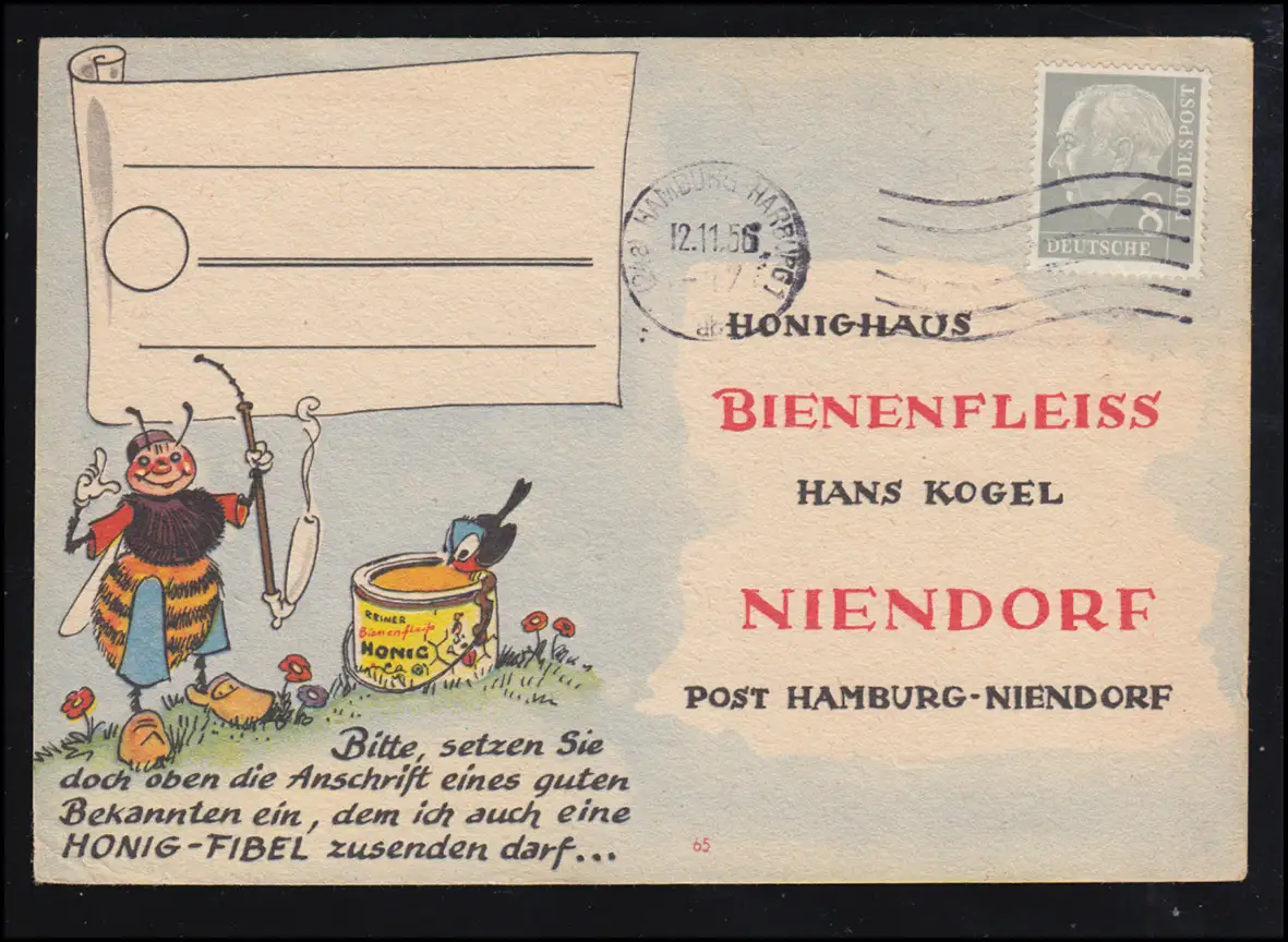 Caricature carte Mielhaus ruche: Abeille avec sifflet de tabac HAMBURG 12.11.1956