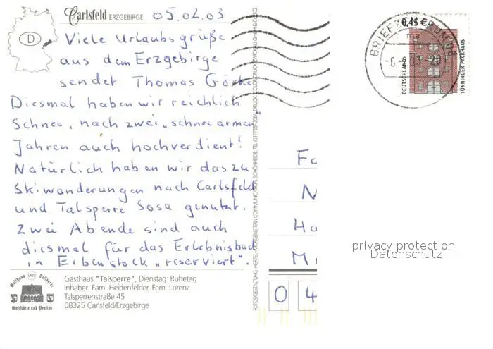 Carlsfeld_Erzgebirge Gasthaus Pension Talsperre Wintersportplatz Carlsfeld Erzgebirge postalisch gelaufen 2003 Erhaltung siehe scans [FriedD77] Frierer