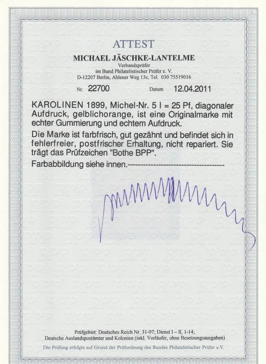 Carolines: Mi Nr. 5 I, post-fraîchissement, BPP Attest