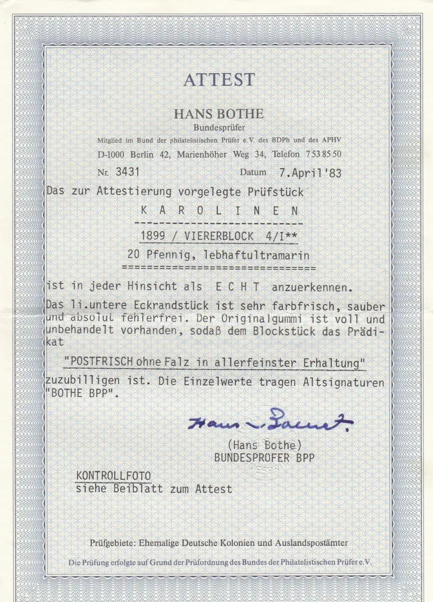 Carolines: Min. 4 I, post-frais, bloc quatre d'angle, BPP Attest