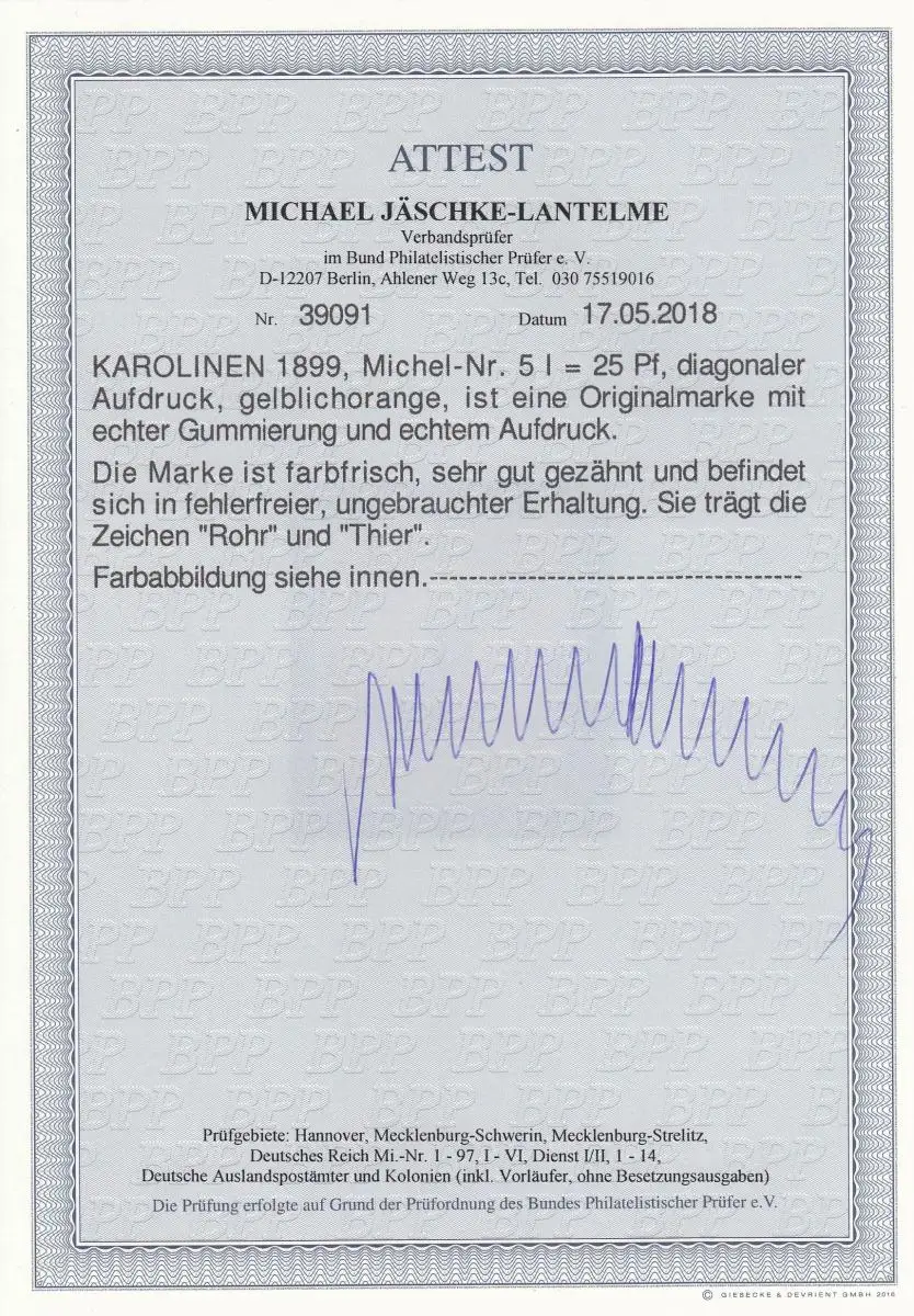 Carolines: Min. 5I, inutilisé, BPP Attest