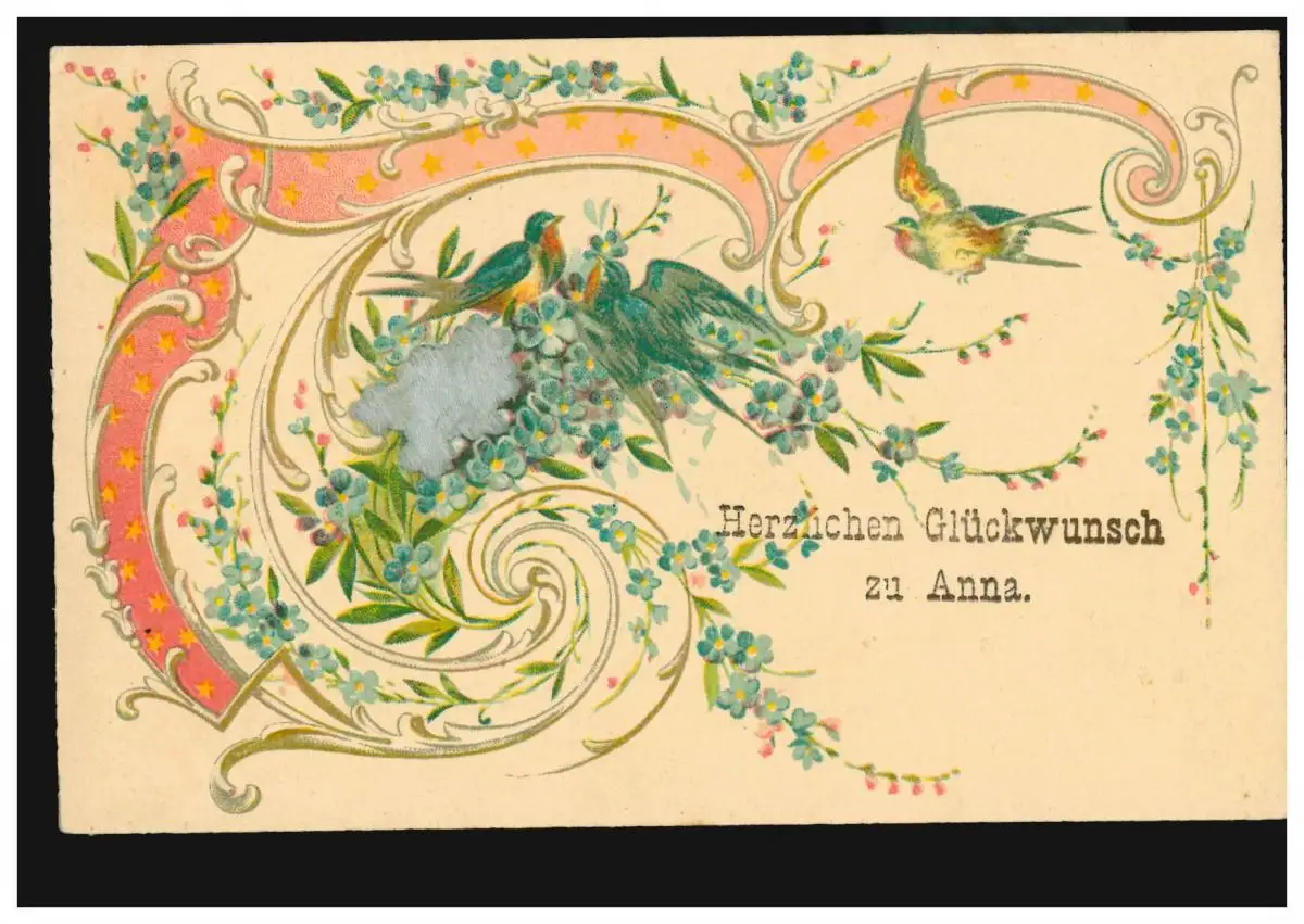 Carte Visual Prénoms: Félicitations à Anna! Girlande Fleurs Oiseaux, inutilisé