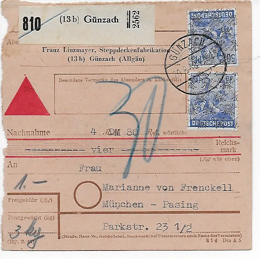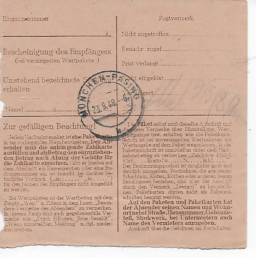 Carte colis reçu, impression de l'expéditeur Günzach après Pasing 1948, MeF
