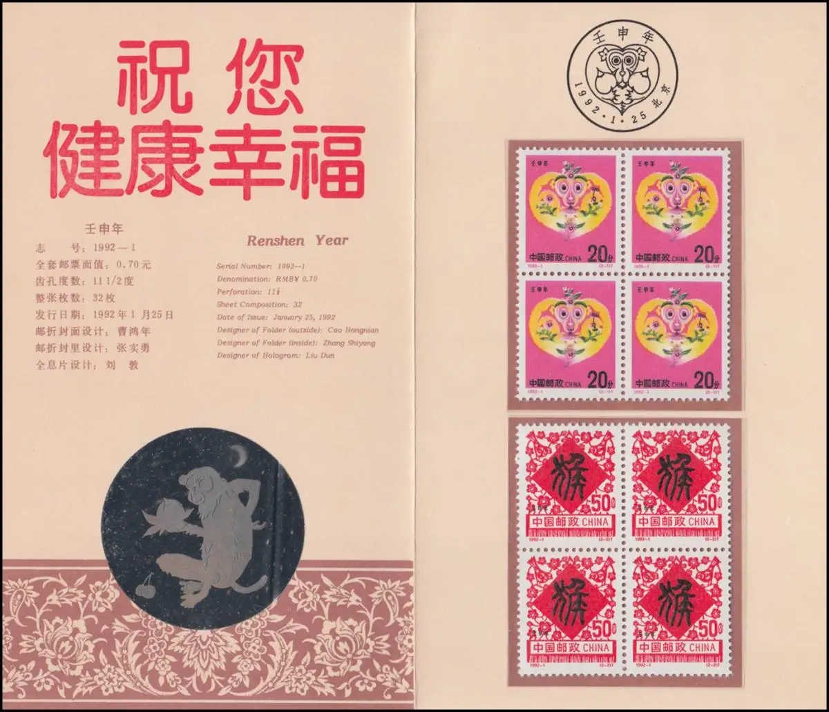 Carte commémorative Chine 2412-2413 Année du singe 1992 - hologramme, blocs à quatre **