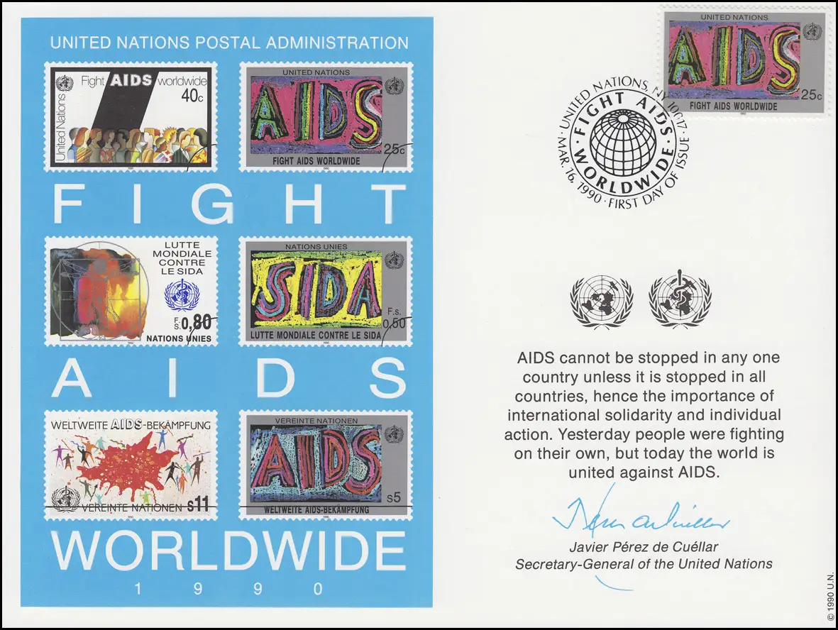 Carte commémorative de l'ONU CE 37 Lutte contre le sida 1990, NY-FDC 16.3.1990