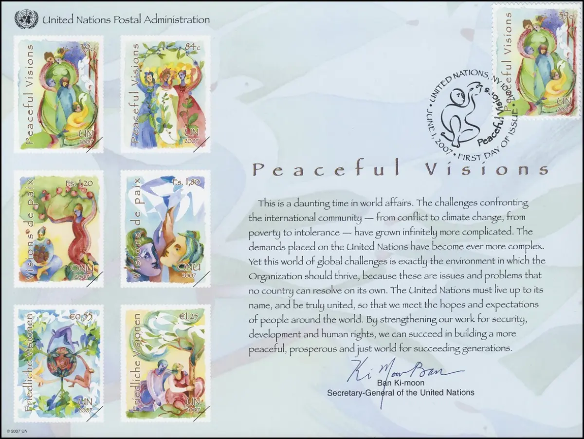 Carte commémorative de l'ONU CE 62 Visions pacifiques 2007, NY-FDC 1.6.2007