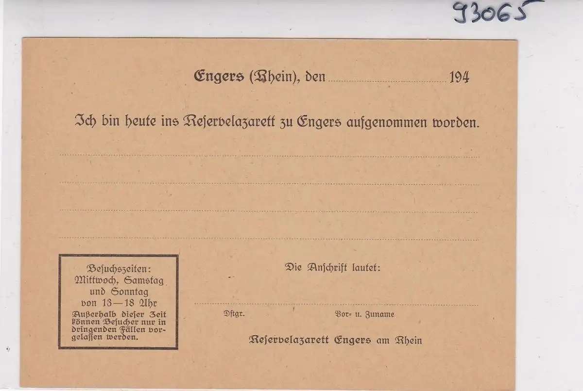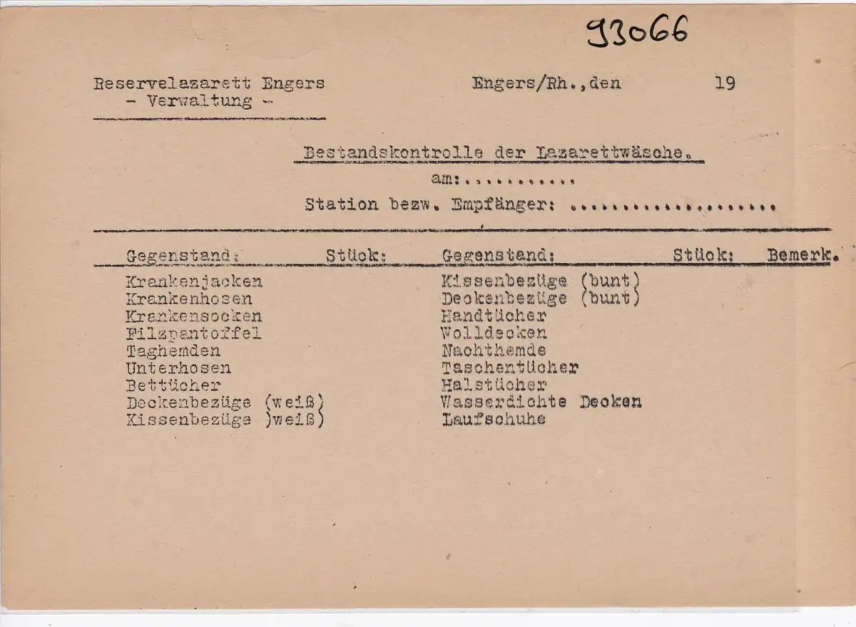 Carte d'accueil de l'hôpital de réserve Engers/Rhein et contrôle des stocks