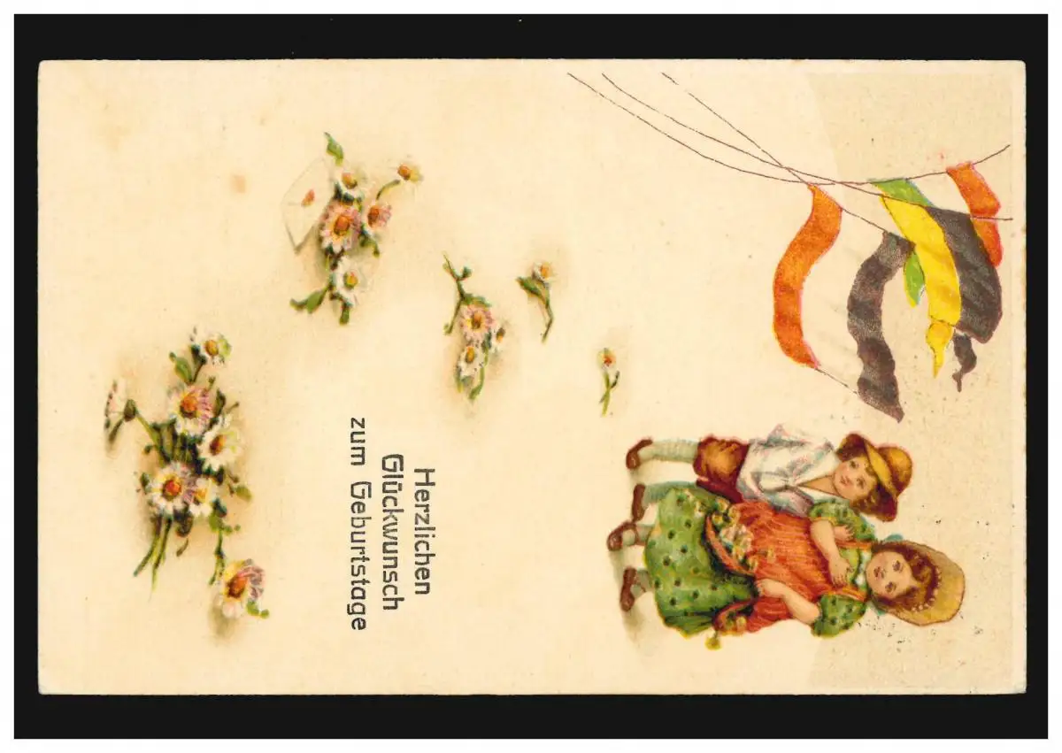 Carte d'anniversaire de fille et de garçon avec drapeaux et fleurs par le poste ferroviaire 1915