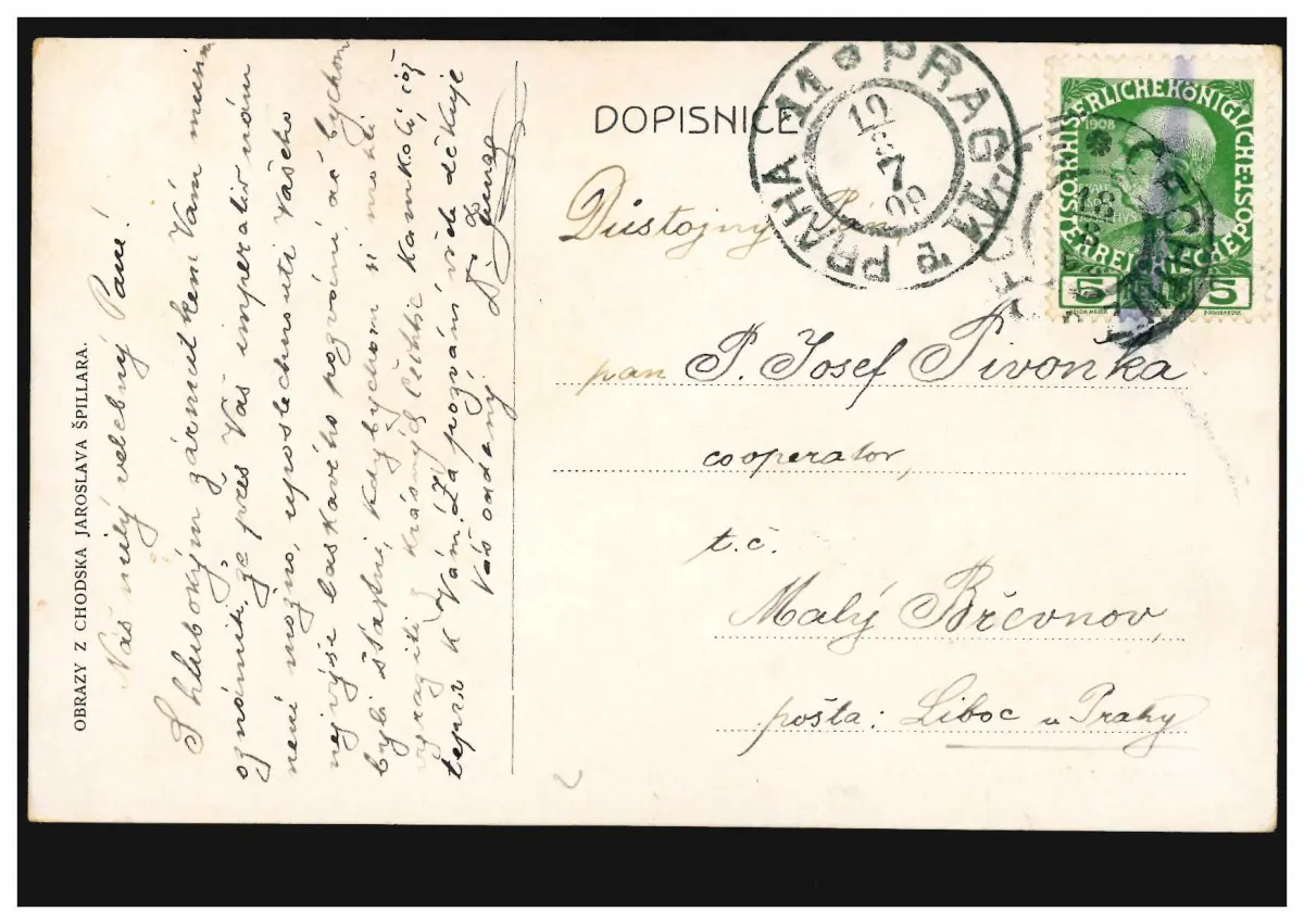 Carte d'artiste U Deda: grand-père avec fille et cheval à bascule, PRAG 1909