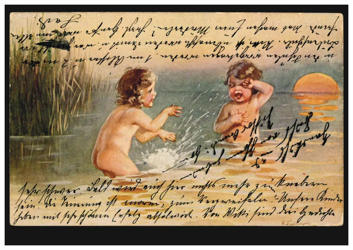 Carte d'artiste Wally Fialkowska: Les enfants se précipitent dans le lac, couru en 1926