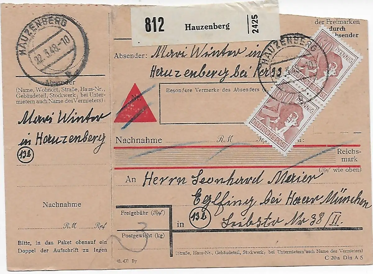 Carte de Hauzenberg vers Eglfing-Haar, 1948, MeF