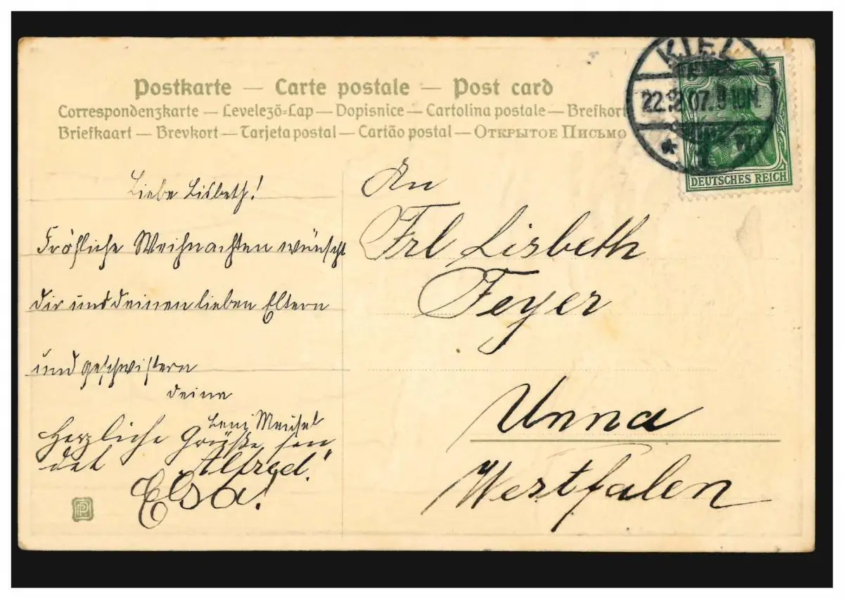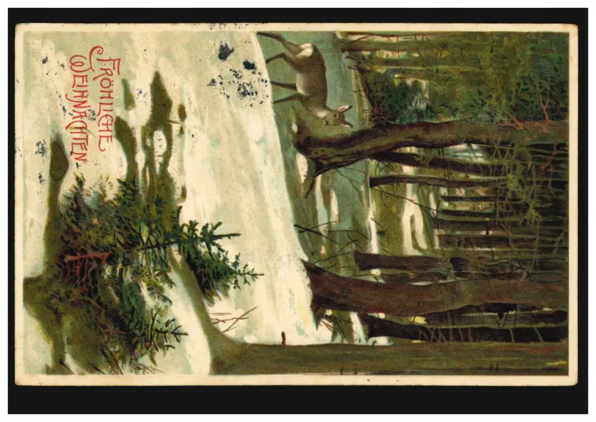 Carte de Noël Reh dans la forêt avec neige, KIEL 22.12.1907