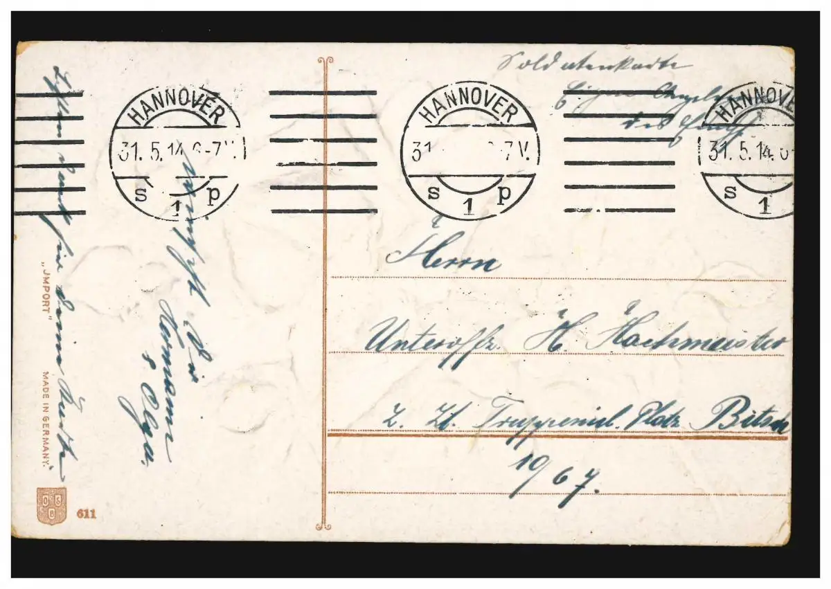 Carte de Pentecôte Penchée, postier de champ HANNOVER 31.1914