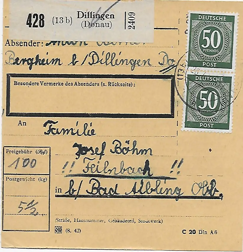 Carte de colis Dillingen vers Feilnbach bei Bad Aibling MeF 1947, Agence Bergheim