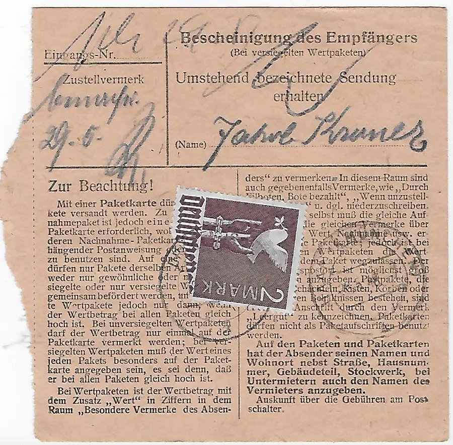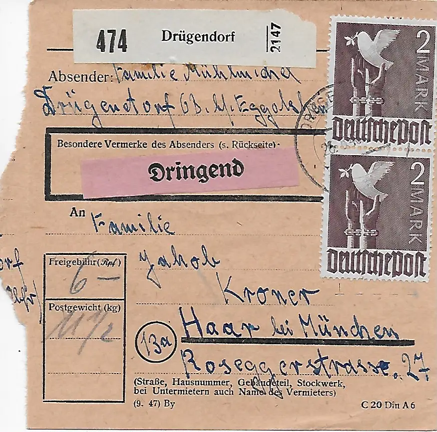 Carte de colis Drügendorf, Urgent pour les cheveux, MeF, marque endommagée