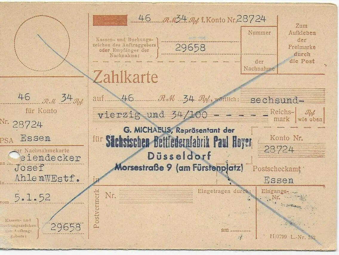 Carte de colis Düsseldorf 1952 vers Ahlen/Westfalen, Bettflederfabrik