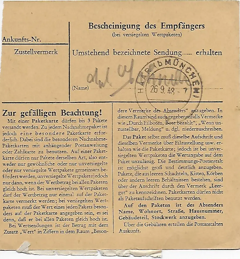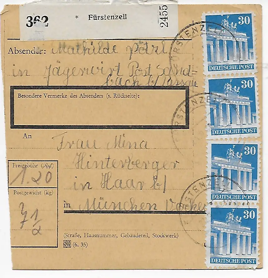 Carte de colis Fürstenzell/Chapitre/Sandbach par Haar, 1948, MeF
