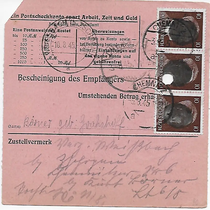 Carte de colis Maschinenfabrik Chemnitz d'après Tschopau, Min. AP 826I, 10.8.45