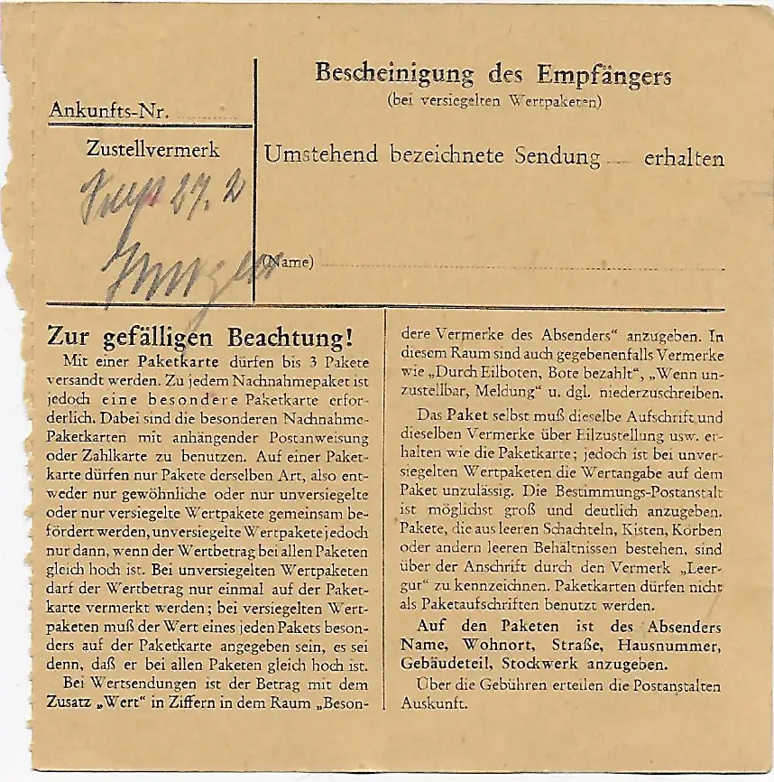 Carte de colis Miesbach, Service après Hohenthann, 1948, EF