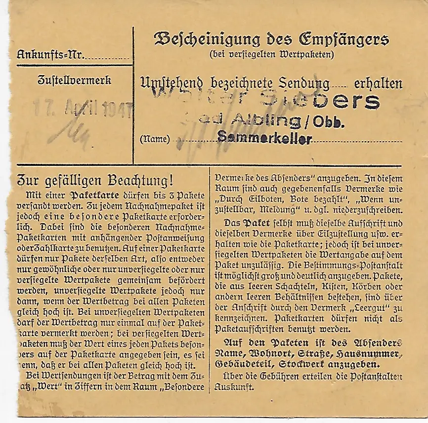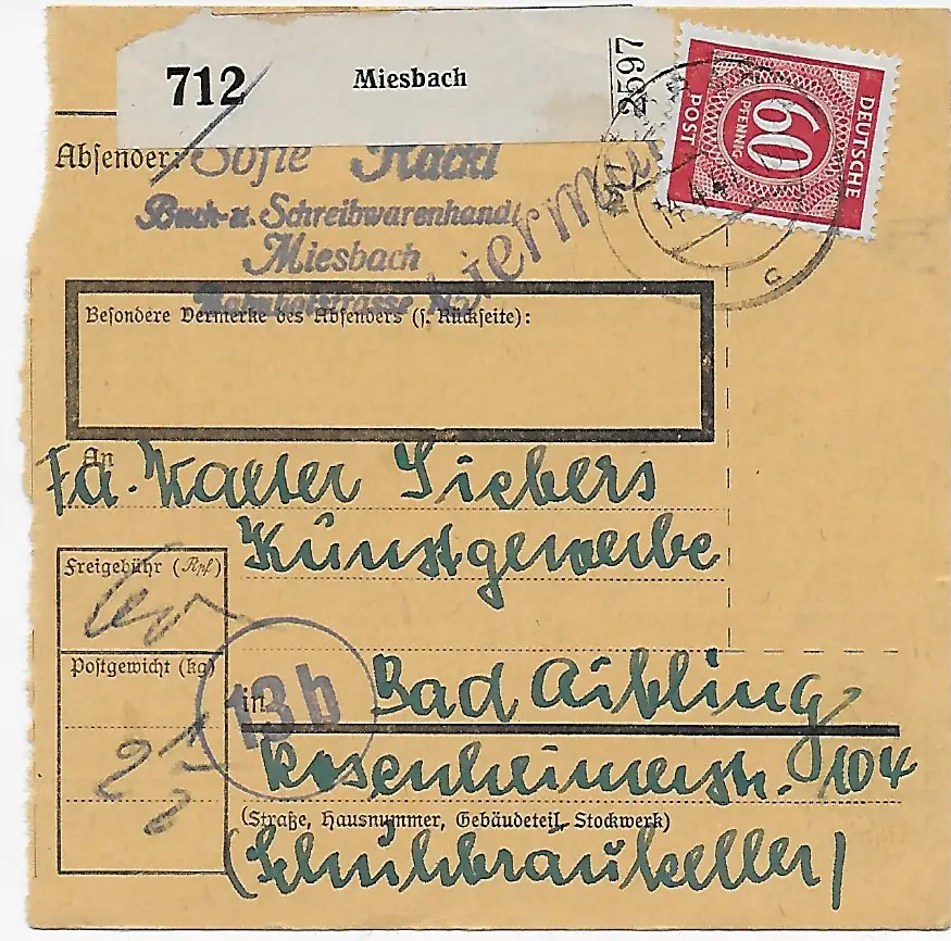 Carte de colis Miesbach vers Bad Aibling, 1948, EF