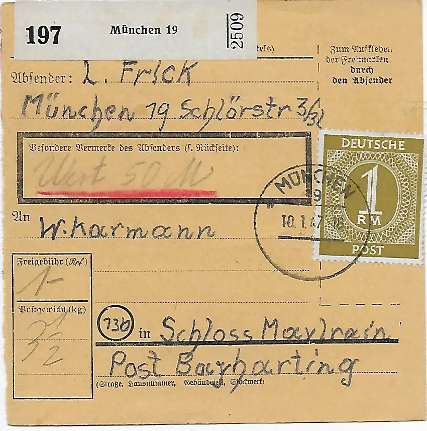 Carte de colis Munich, valeur, selon le château Maxlrain 1947, EF