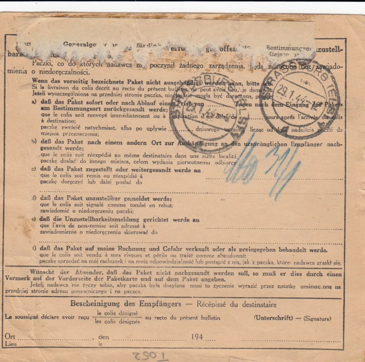 Carte de colis international GG Lemberg à Strasbourg, Sac-post-Frew.Div. Galice